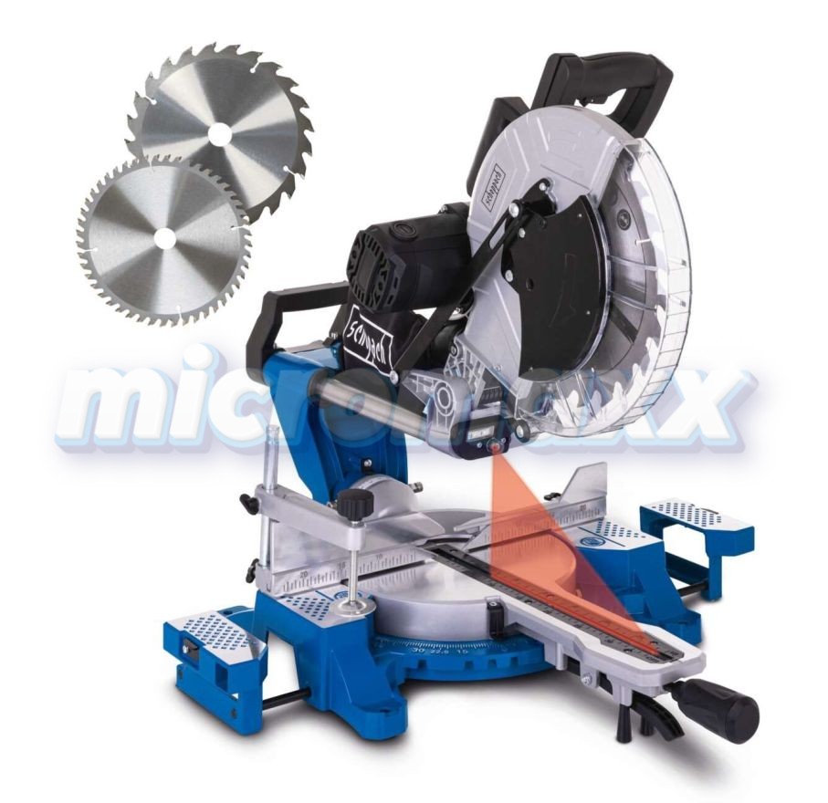 - W zestawie znajdują się dwie tarcze z węglika spiekanego (24 i 48 zębów), o średnicy 305mm, które gwarantują czyste i precyzyjne cięcia.